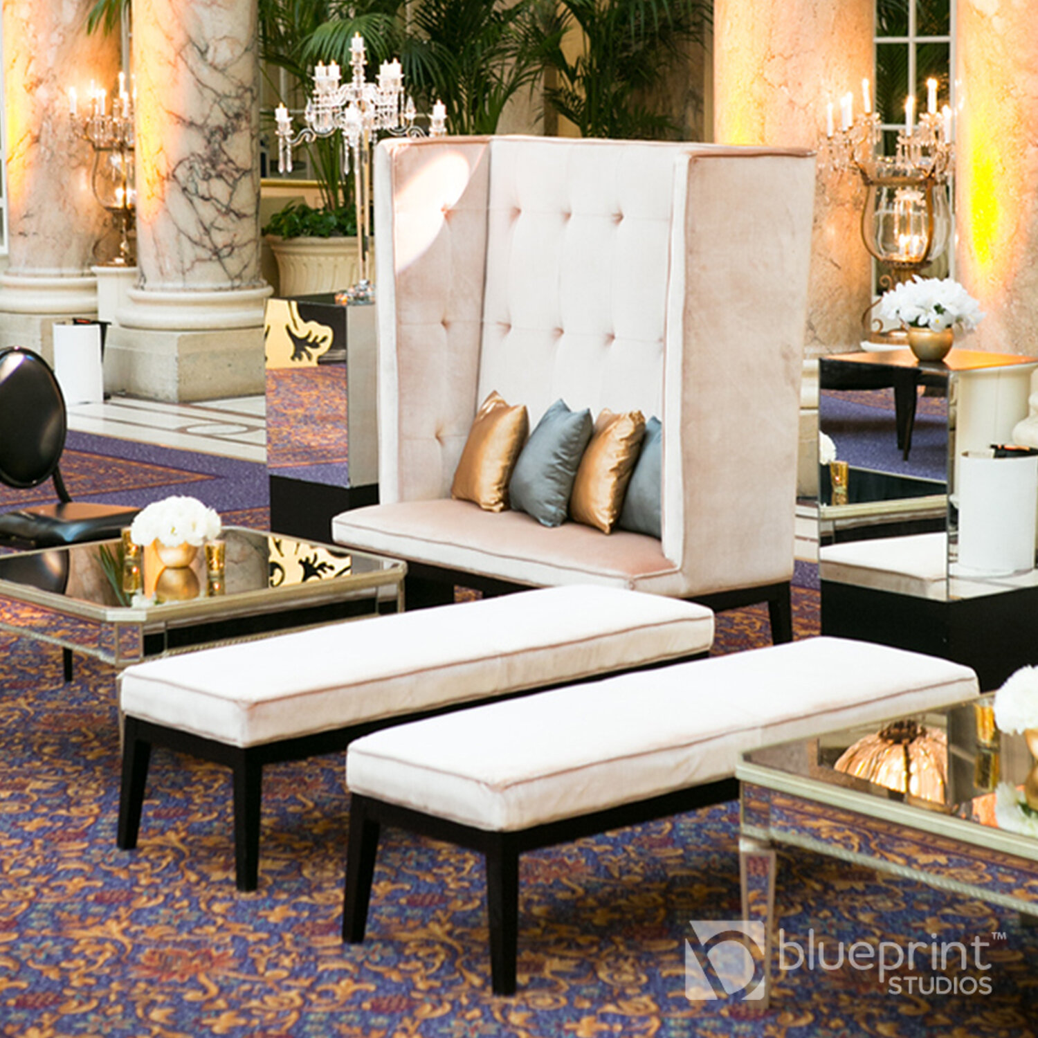 The elegant fabric and mirrored panels are finished with a glamorous champagne coloring.