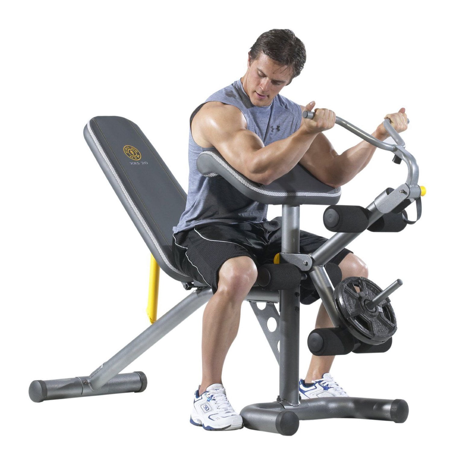 The gold's gym xrs 20 is weight bench that comes with a squats rack, and also includes a preacher pad, and a leg workout station.